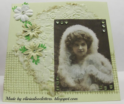 Pia har lavet dette vintage kort i vinterfarver. De mange blingbling sten passer så fint til motivet på billedet og det vintertema, som Pia har skabt.